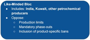 - India reiterated its opposition to binding commitments on product phase-outs, aligning with a bloc of oil-producing nations.