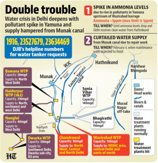 - The crisis, which disrupted supply to nearly 50% of the city, was caused by a “double blow”: record-breaking ammonia levels in the Yamuna River and the unscheduled closure of the Munak Canal for repairs.