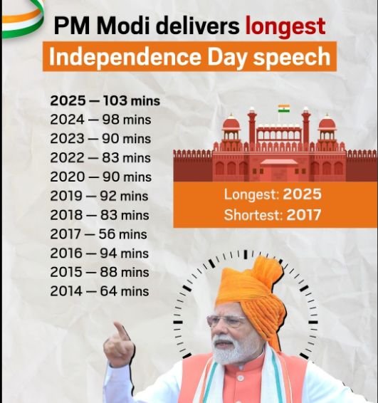 - On August 15, 2025, Prime Minister Narendra Modi delivered the longest Independence Day speech in India’s history, lasting 103 minutes.