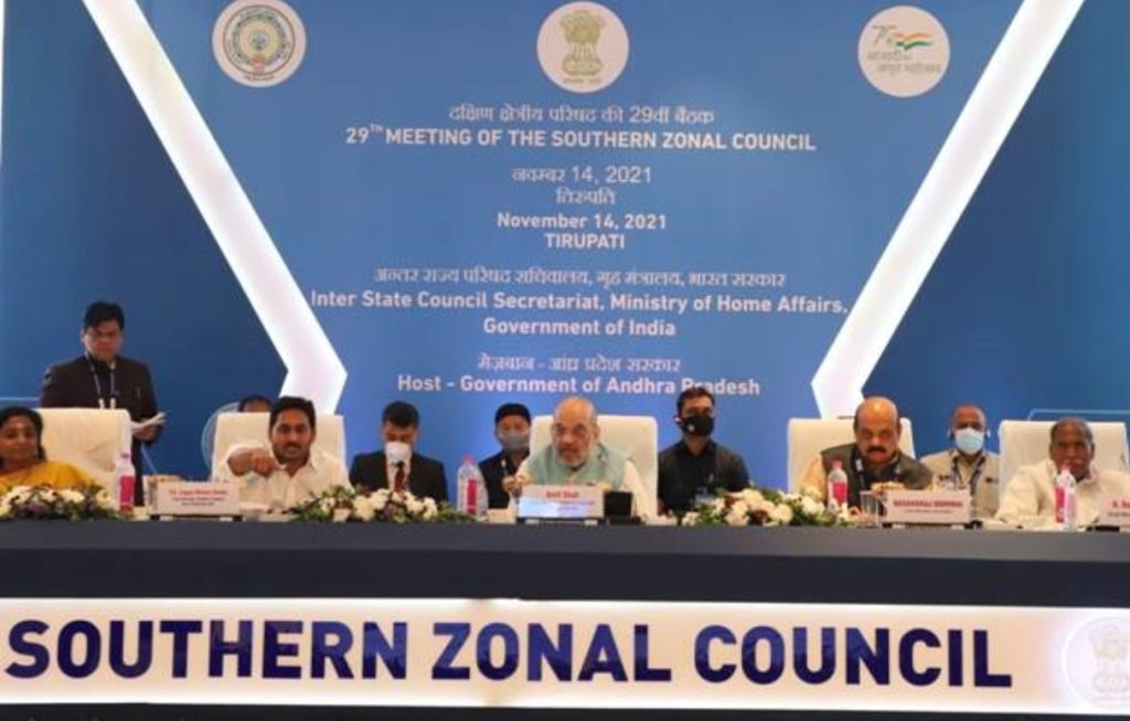 केन्द्रीय गृह एवं सहकारिता मंत्री श्री अमित शाह ने आज तिरुपति में दक्षिण क्षेत्रीय परिषद की 29वीं बैठक की अध्यक्षता की। बैठक में आंध्र प्रदेश, कर्नाटक और पुडुचेरी के मुख्यमंत्री, पुडुचेरी व अंडमान एवं निकोबार द्वीप समूह के उपराज्यपाल तथा लक्षद्वीप के प्रशासक शामिल हुए। साथ ही परिषद में शामिल राज्यों के मंत्री, केन्द्रीय गृह सचिव, अन्तर राज्य परिषद की सचिव और संबंधित राज्यों व केंद्र शासित प्रदेशों के मुख्य सचिव और अन्य वरिष्ठ अधिकारी भी बैठक में उपस्थित थे। केन्द्रीय गृह मंत्री ने दक्षिण क्षेत्रीय परिषद की 29वीं बैठक भगवान श्री वेंकटेश्वर की पावन नगरी तिरुपति में आयोजित करने के लिए आन्ध्रप्रदेश के मुख्यमंत्री श्री वाई. एस. जगन मोहन रेड्डी का धन्यवाद किया।